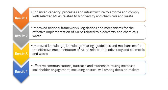 The specific objective is to strengthen the implementation of MEAs in the chemicals and waste and biodiversity clusters at the national and regional levels in ACP countries through the development of stronger compliance and enforcement measures. This will contribute to support ACP countries in addressing the challenges associated with the sound management of chemicals and waste, and loss of biodiversity.